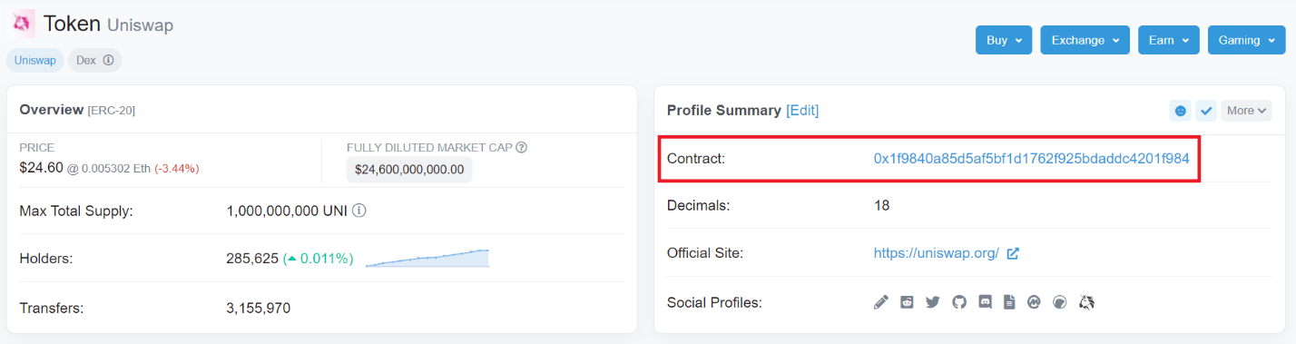 ‘프로파일 요약(Profile Summary)’ 아래에는 유니스왑의 스마트 계약 주소가 있습니다.