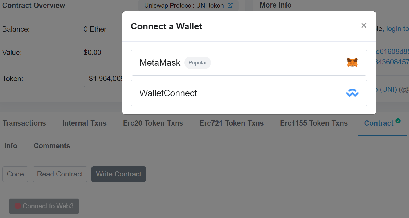더 자세히 살펴보면, ‘계약(Contract)’ 탭으로 이동하면 계약 코드를 볼 수 있습니다. 또한, 웹브라우저 지갑이 설치되어 있으면 ‘계약서 작성(Write Contract)’ 아래의 ‘웹3로 연결(Connect to Web3)’에서 직접 계약서를 볼 수 있습니다.