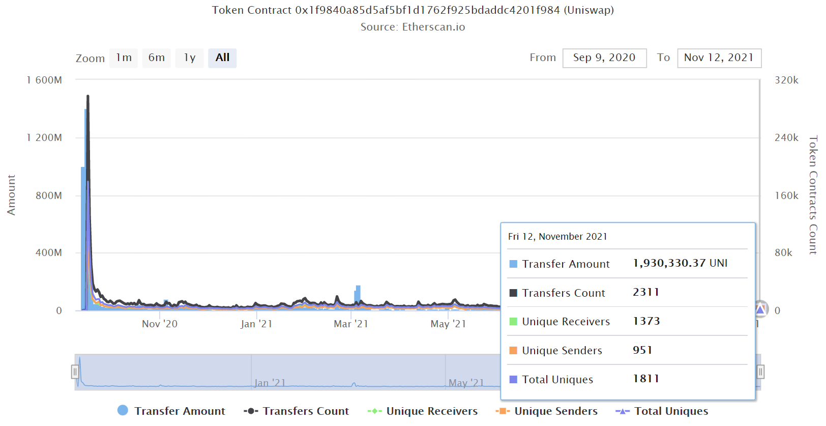 그 다음 계약서 자체를 클릭하면 DEX 트레이드를 포함한 유니스왑에서 취급하는 모든 전송 목록이 나타납니다. 여기서 애널리틱스(Analytics) 탭으로 이동하여 유니스왑 토큰 계약에 포함된 모든 관련 데이터의 스냅샷을 볼 수도 있습니다.