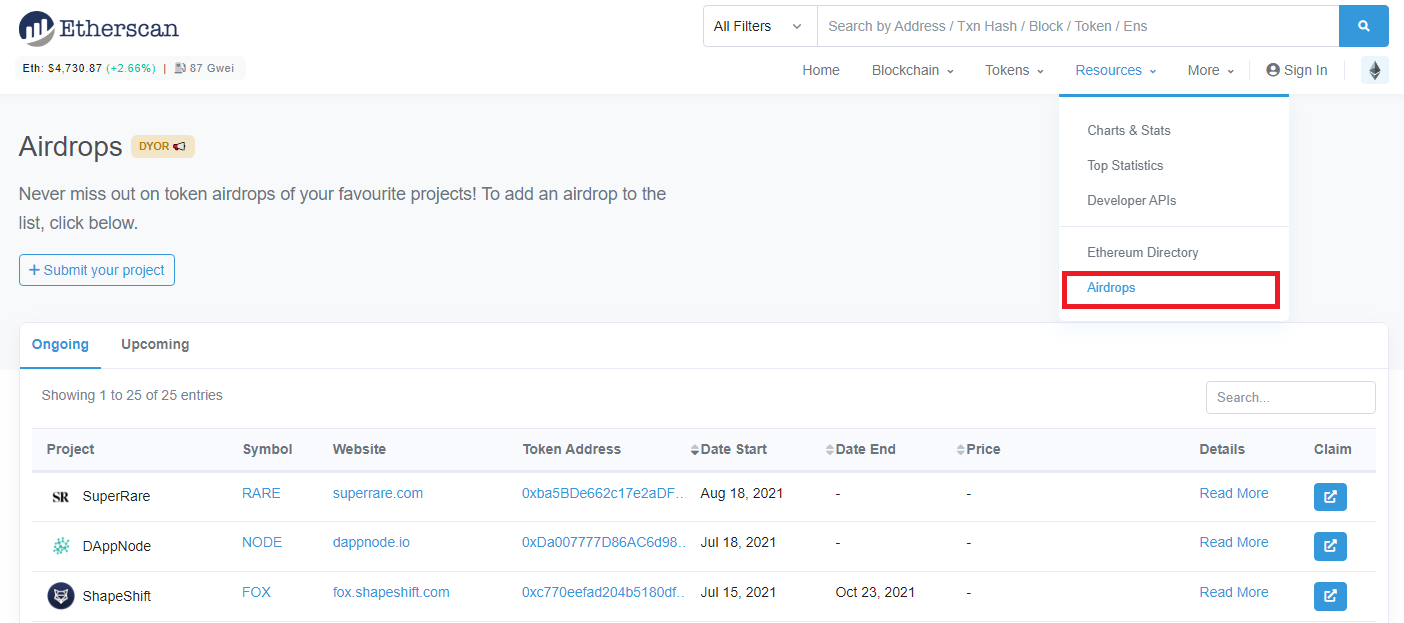 이더스캔의 “리소스(Resources)” 카테고리에는 진행 중인 에어드랍(airdrop)과 향후 에어드랍 목록이 있습니다. 이것은 무료 토큰을 획득하는 좋은 방법이며, 나중에는 가치가 돋보이게 될 것입니다. 모든 목록에 대한 ‘자세히 읽기(Read More)’ 아래에는 에어드롭 제출자가 지갑에 토큰을 넣기 위한 모든 필수 조건에 대한 자세한 설명을 제공합니다.