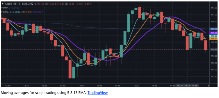 단기 트레이딩 또는 스캘핑은 짧은 주기로 매일 여러 차례 주문을 내는 것을 말합니다. 스캘핑을 하려면 아주 짧은 기간의 이동평균선을 사용하는 것이 좋습니다. ‘5-8-13 EMA’ 전략은 아주 작은 가격 변동에도 대응할 수 있습니다.