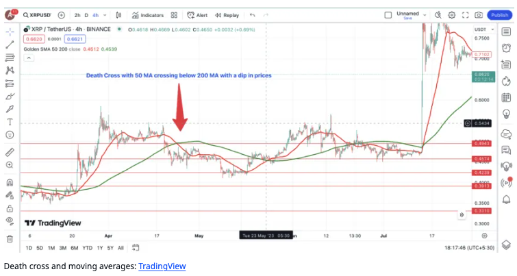 반대로, 데스 크로스는 장기 이평선이 단기 이평선 위로 교차할 때 발생합니다. 이는 약세가 커지고 있다는 것을 나타내며, 숏 포지션을 선호하고 더 급격한 하락을 경험하는 ‘하락 칼 패턴(falling knife patterns)’으로 이어질 수 있습니다.