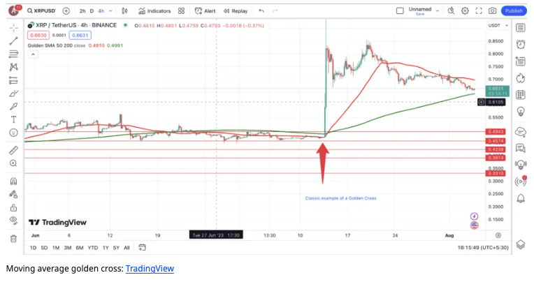 골든 크로스는 단기 이동평균이 장기 이동평균 위로 교차할 때 나타나는 강세 신호입니다. 이 크로스오버 형태는 횡보 또는 오히려 약세장에서 강세장으로의 전환을 나타냅니다. 골든 크로스는 매수세가 서서히 주도권을 잡고 있음을 나타냅니다. 이 때 매수 포지션에 진입하는 것이 좋습니다.