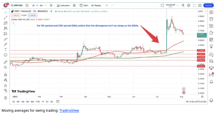 이때 50일 및 200일 이동평균이 가장 유용하게 사용됩니다. 예를 들어 50일 이동평균과 200일 이동평균이 모두 상승하면 상승 추세를 나타내는 것일 수 있습니다. 스윙 트레이딩은 며칠에 걸쳐 이루어지므로 올바른 매매 신호를 포착하려면 지수이동평균(EMA) 대신 단순이동평균(SMA)을 사용하는 것이 좋습니다.