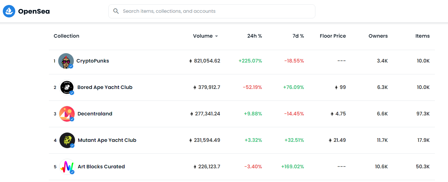 NFT 프로젝트를 연구할 때 거래량은 또 다른 중요한 지표다. 특정 NFT 컬렉션에 대한 거래량이 많거나 증가하면 그에 대한 수요가 증가하고 있음을 알 수 있기 때문이다.