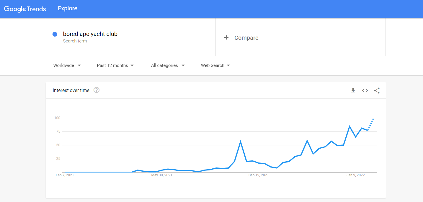 구글 트렌드(Google Trends)는 주제나 키워드에 대한 대중의 의견에 대한 훌륭한 통찰력을 제공하는 환상적인 무료 도구이다. 단어 검색의 등급은 0에서 100까지다. 높은 등급은 사람들이 NFT 컬렉터블에 관심이 있다는 것을 나타낸다. 구매하기 좋은 시기라는 것도 간접적으로 알려준다.