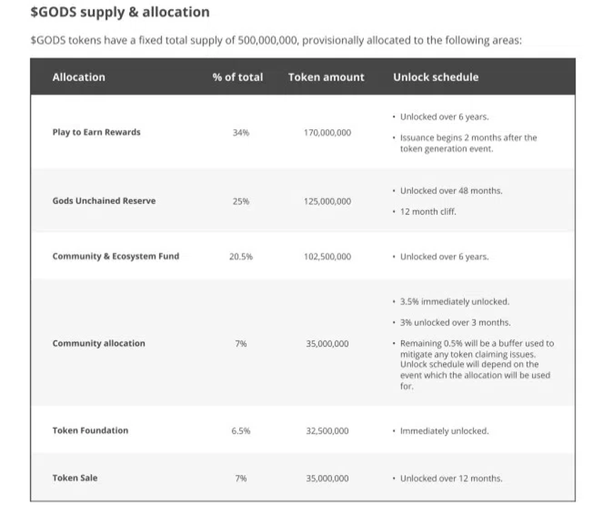 갓즈 언체인드 토큰은 게임의 통화와 거버넌스 역할을 모두 하는 ERC-20 토큰이다. 현재 가격은 0.21달러이며, 순위는 400위권이다. GODS의 시가총액은 약 3200만달러이며, 토큰 공급량은 다음과 같다: