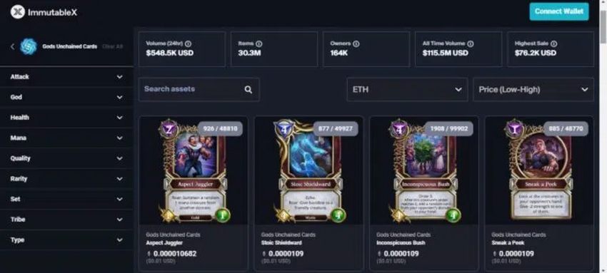 게임 내 카드 중 일부는 2차 시장에서 거래될 수 있는 NFT(대체불가능 토큰)다. 게임 내 아이템은 GODS 토큰이나 플럭스(Flux)라는 다른 게임 통화를 사용하여 NFT로 민팅할 수 있다. 코어 및 웰컴 세트 카드는 판매할 수 없다. 결국 플레이하고 수익을 얻는 과정에서 플럭스를 이용해 비블록체인 카드를 강화해 거래 가능한 자산으로 만들 수 있다. 새로운 카드가 출시될 경우 거래되기 전에 균형 단계를 거친다.