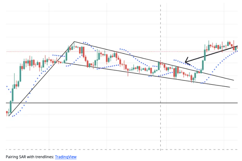 가격이 상승 추세에 있고 파라볼릭 SAR이 가격 아래에 차트에 표시되는 경우 SAR 계열의 점 위에 지지선을 그려, 가격 이탈 또는 손절매를 설정할 수 있습니다. 이렇게 하면 수익을 극대화하고 손실을 최소화할 수 있습니다. 비트코인을 공매도할 계획이라면 가격 하락 추세와 가격 위에 표시된 SAR 차트를 고려할 수 있습니다. SAR에 그려진 저항선은 숏 주문에서 손절 시점을 찾는 데 도움이 될 수 있습니다.