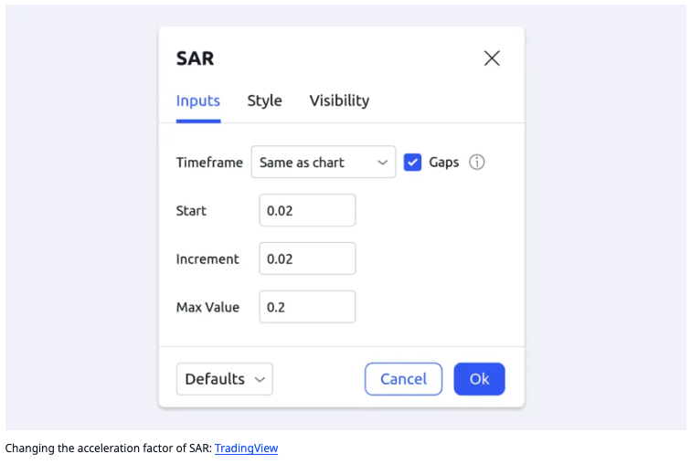 파라볼릭 SAR은 가속도 계수(AF)와 극한점(EP)이라는 두 가지 요소로 구성해 있습니다. 가속도 계수는 새로운 포물선 점이 어디에 형성될지 결정합니다. 기본값은 0.02이지만, 주가가 새로운 고점이나 저점을 만들 때마다 최대 0.20까지 올라갈 수 있습니다.