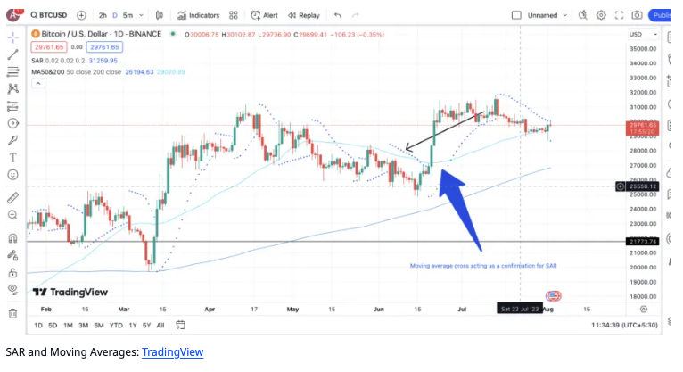- SAR을 이동평균과 함께 사용하고, 데스 및 골든 크로스오버를 포착