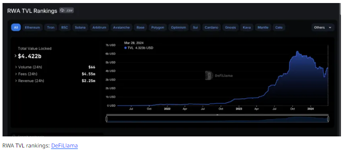 디파이라마 데이터에 따르면, 2024년 3월 29일 실물자산토큰(RWA)의 총자산규모(TVL)는 40억 달러가 넘었습니다.