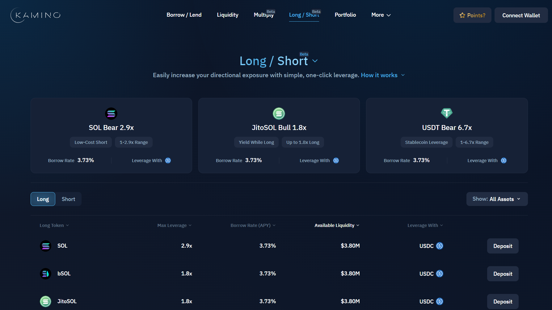 카미노는 예치, 대출, 유동성 공급과 더불어 레버리지 투자와 롱/숏 볼트를 제공하는 디파이 프로토콜입니다. 특히, 레버리지 투자를 지원하는 점에서 다른 솔라나 디파이 프로토콜들과 차별화됩니다.