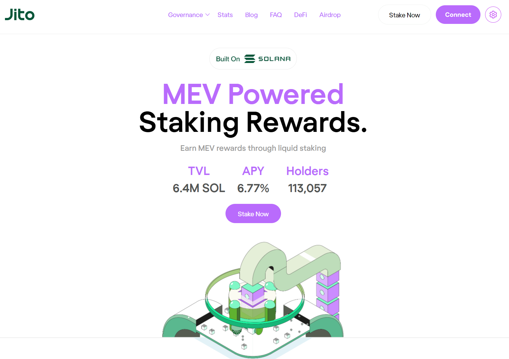이 프로토콜의 가장 큰 특징은 기존 솔라나 네트워크와는 따로 벨리데이터를 구동하면서 블록 생성 과정에서 생기는 추출 가능 최대 가치(Maximum extractable value, MEV) 수익을 JITOSOL 보유자에게 나눠준다는 것입니다. MEV란 블록체인 거래를 처리하는 과정에서 발생하는 일종의 차익거래 기회를 말합니다. 그러니까 1 JITOSOL을 그냥 보유하고 있으면 기존 솔라나 스테이킹 보상에 MEV 보상까지 추가로 받게 되는 셈이지요.