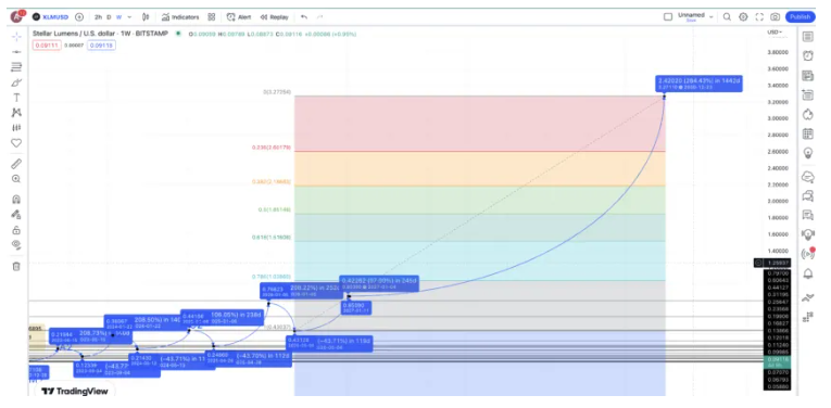 따라서 일반적인 성장률인 208.31% 대신 XLM의 다음 고점은 98.01% (위 표의 최소 성장률) 의 성장 수준에서 결정될 것으로 예상할 수 있습니다. 이렇게 되면 다음 레벨인 C3는 $0.85가 됩니다. 그리고 여기서 흥미로운 점이 있습니다.