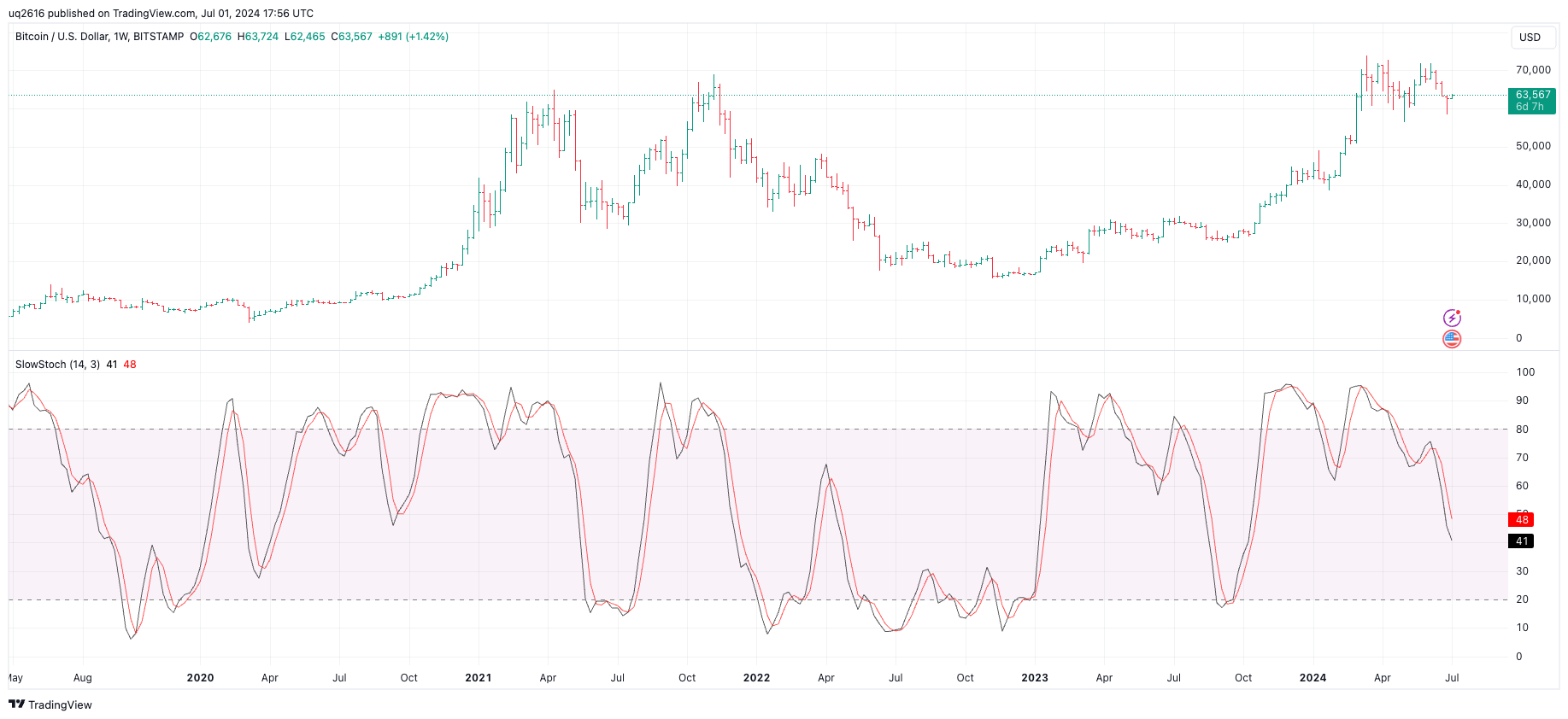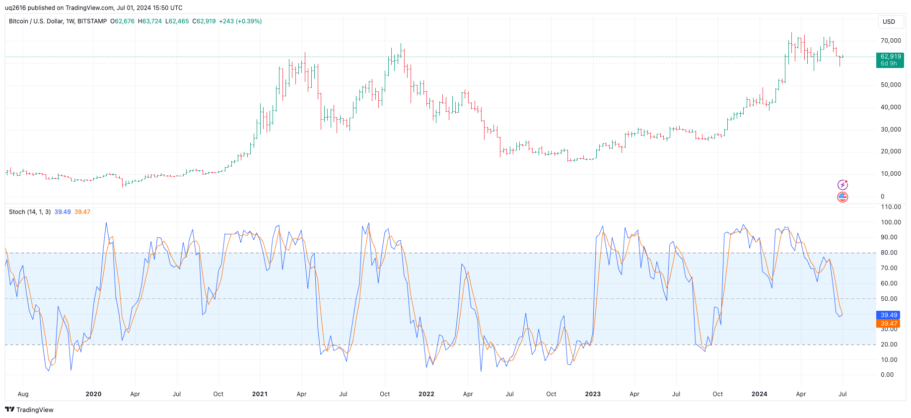 2024년 7월 2일 비트코인은 6만 3000달러에 거래되고 있습니다. 이는 24시간 전 대비 2.4%가량 상승한 가격입니다. 스토캐스틱 차트를 살펴볼까요? 아래 차트는 트레이딩뷰가 제공하는 것으로, 아래 파란색 선이 %K 값을 나타내며 오렌지색 선은 %K의 단순이동평균인 %D 값을 표시합니다.