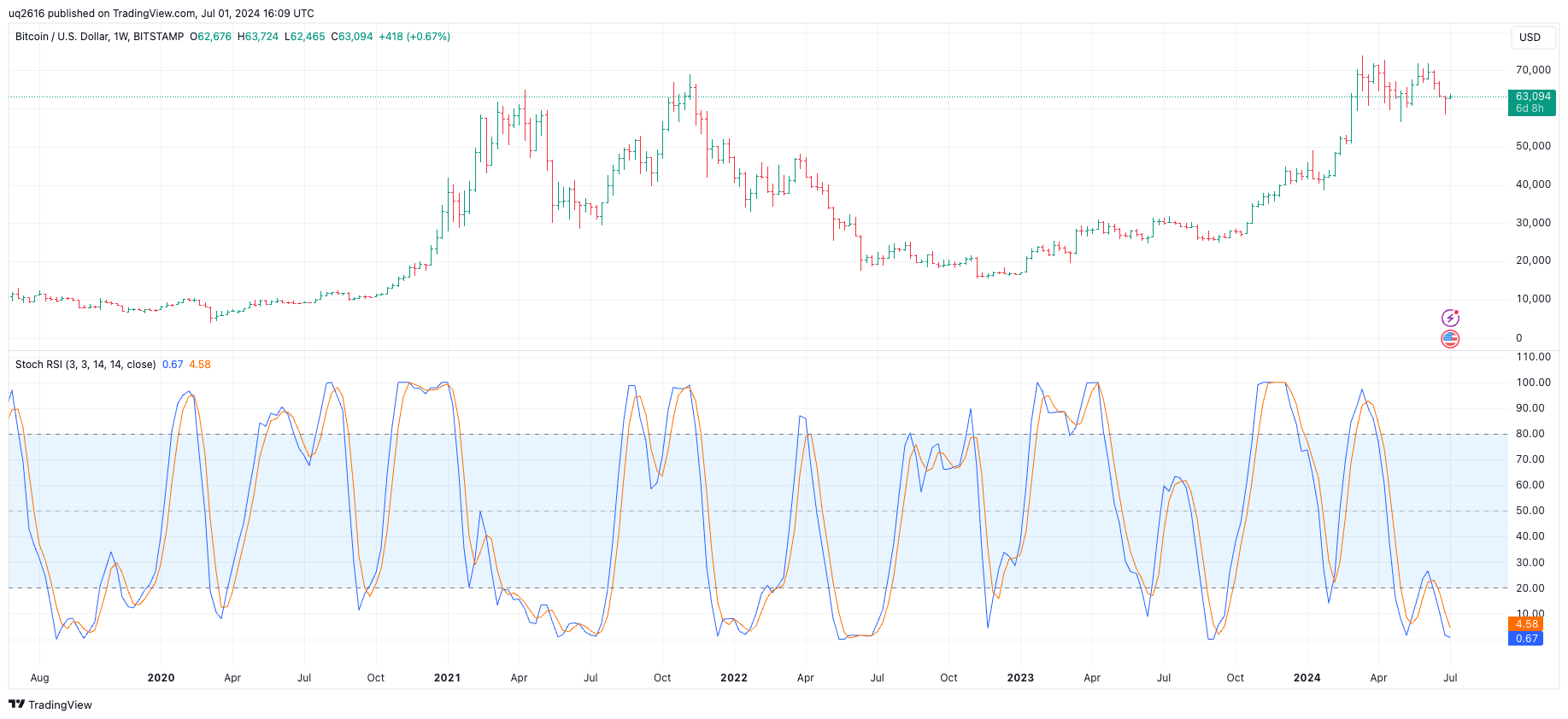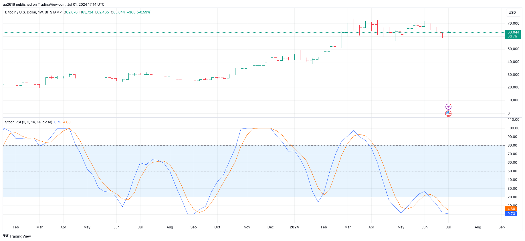 수치가 0에서100까지 움직이는 원리는 스토캐스틱과 동일합니다. 80 범위를 초과하면 ‘과매수 영역’에 진입하고, 20 미만은 ‘과매도’로 간주합니다. 아래 차트에서는 파란색 선이 %K를 나타내고, 오렌지색 선이 %D를 가리킵니다. 2024년 7월 2일 기준, 비트코인의 스토캐스틱 RSI는 과매도를 나타내고 있네요.