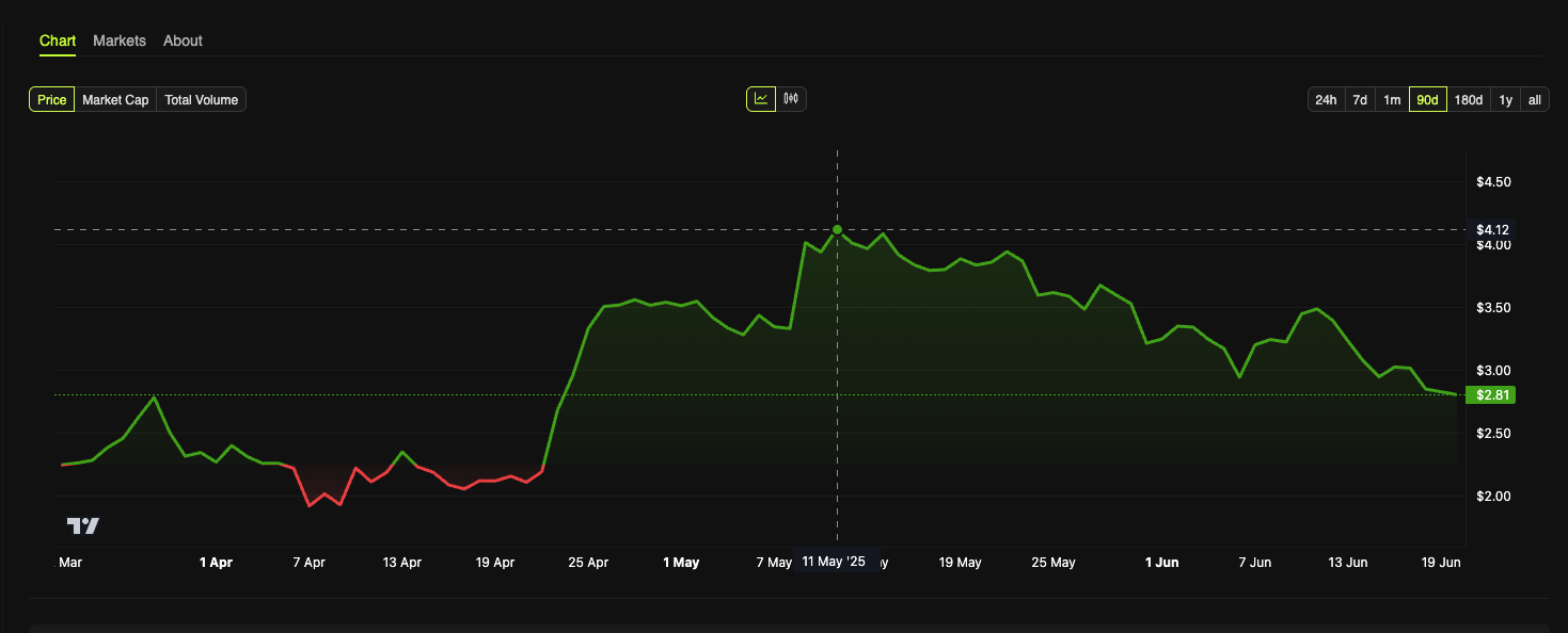 Sponsored2025년 6월 20일 기준, 수이(SUI) 가격은 개당 2.81달러로 시가총액은 95억 달러 이상입니다. 전체 암호화폐 시가총액 순위 16위를 차지하고 있습니다.