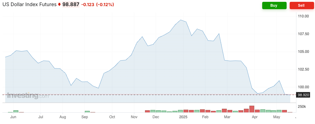 2025년 5월 27일 기준, 달러 인덱스는 98.8을 나타내고 있습니다. 2024년 12월을 정점으로 대체로 하락하고 있는 추세입니다.