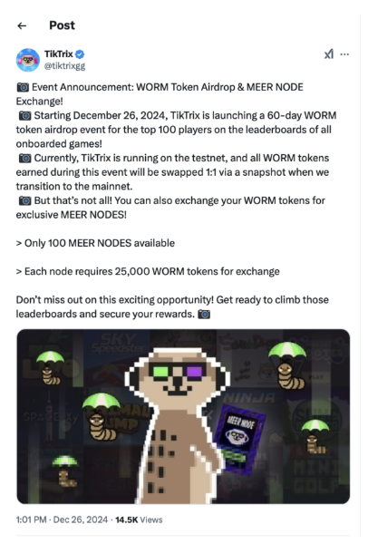 알고 계셨나요? 틱트릭스(TikTrix)의 2차 유틸리티/보상 토큰인 WORM 토큰은 특별한 게임 내 상호작용과 소액 결제에 사용됩니다. WORM 토큰은 플레이어가 프리미엄 콘텐츠에 액세스할 수 있도록 독특한 게임 플레이 인센티브를 제공함으로써 $TRIX를 보완합니다.