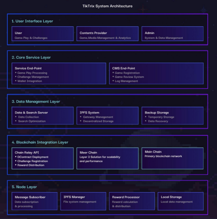 체인 릴레이 API(Chain Relay API)와 미어 체인을 활용함으로써 틱트릭스(TikTrix)는 스마트 컨트랙트를 관리하고, 게임 챌린지를 등록하며, 보상을 투명하게 분배합니다. 이 레이어는 모든 거래가 안전하고 검증 가능하도록 보장하여 사용자의 신뢰도를 향상시킵니다.