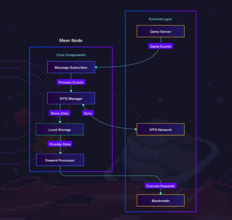 게임 플레이나 챌린지 완료와 같은 사용자 행동은 블록체인에 기록되고 처리됩니다. 데이터는 IPFS를 사용하여 수집과 분석, 투명성, 무결성을 보장합니다. 보상은 미어 체인(Meer Chain)을 통해 분배됩니다.