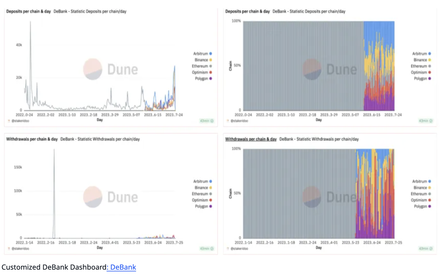 데이터 플랫폼 디뱅크(DeBank)는 듄 애널리틱스와 유사하게 작동합니다. 듄에서 고가 지갑이나 스마트 머니 지갑을 식별한 후, 해당 주소를 디뱅크로 복사해 보다 총체적인 정보를 추적할 수 있습니다. 독립형 대시보드인 디뱅크(DeBank)는 체인별 입출금과 같은 몇 가지 스마트 머니의 정보를 제공합니다.