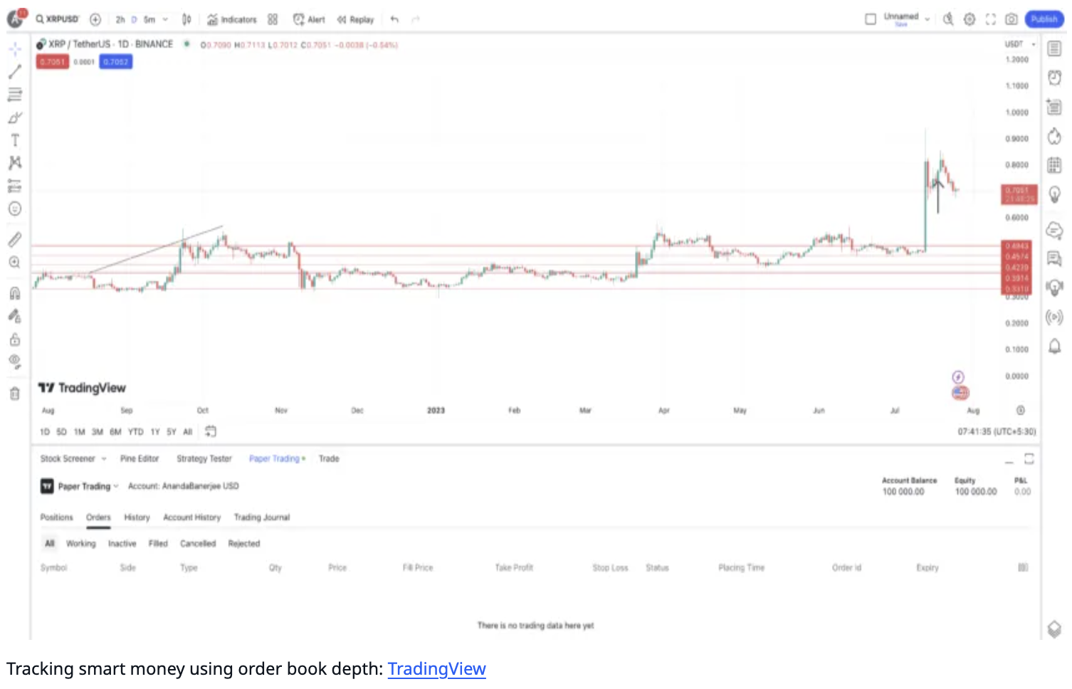 오더북 심도는 스마트 머니를 추적하는 데 유용한 도구가 될 수 있습니다. 첫째, 가장 큰 거래를 찾는 데 도움이 됩니다. 둘째, 오더북 심도는 특정 코인으로 들어오고 나가는 자금 흐름을 추적하는 데도 도움이 됩니다. 예를 들어, 매수 주문이 쌓여 있다면 큰손이 특정 자산을 축적하고 있다는 것을 확인할 수 있습니다,