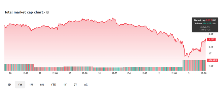 트럼프의 관세가 발표된 이후, 암호화폐 시장은 주식 시장과 함께 폭락했습니다. 총 암호화폐 시가총액은 단 하루 만에 약 8% 하락하여 약 3조 2천억 달러로 떨어졌습니다.