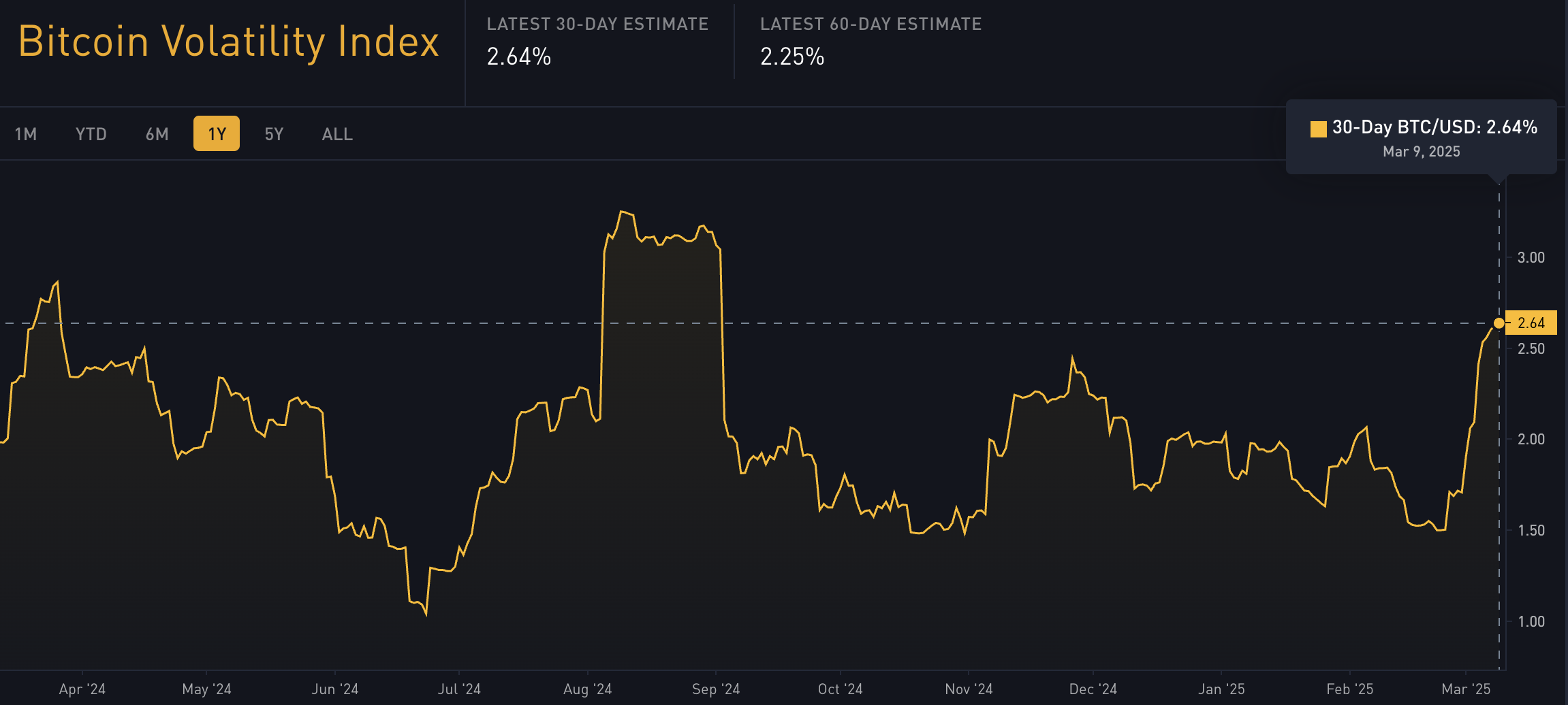2025년 3월 11일 기준, 비트코인 VIX는 최근 30일 동안 약 2.64%를 나타냈습니다. 일반적으로 비트코인 VIX가 3% 이상일 때, 가격이 큰 폭으로 변동할 가능성이 높다고 판단합니다. 따라서 2.64%는 비트코인 역사상 적지 않은 변동성을 의미하며, 향후 더 큰 폭의 변동성이 나타날 수 있다는 것을 암시합니다. 2.64%는 2024년 8월(3.25%) 이후 가장 높은 수치입니다.