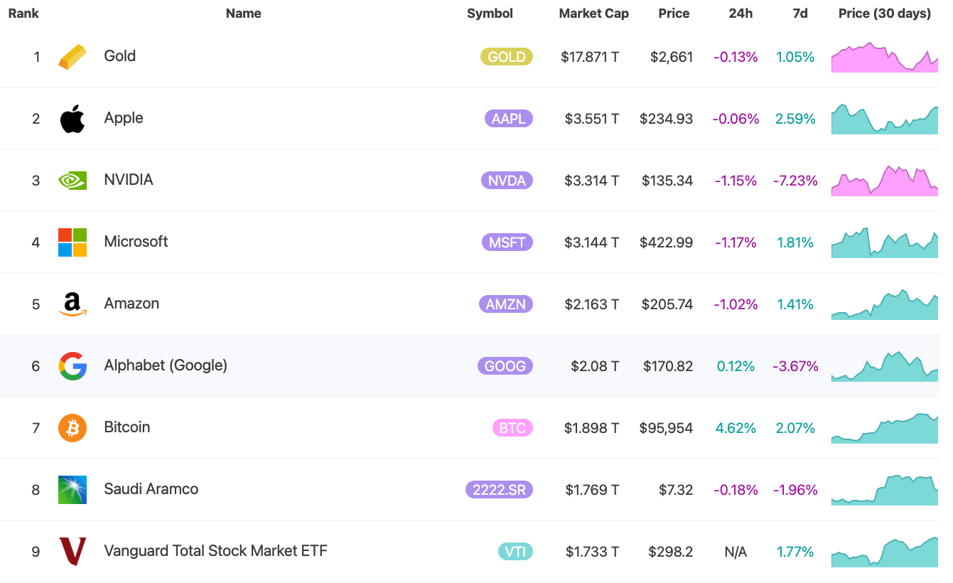 2024년 11월 6일, 비트코인이 글로벌 시가총액 10대 자산에 재진입했습니다. 이날 시가총액은 1.4조 달러대로 9위에 랭크돼 있다. 1~3위는 금과 엔비디아, 애플이었습니다.