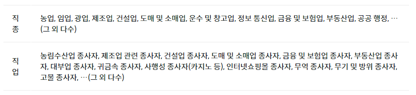 우선 자택과 직업 정보를 제시된 보기 중에 골라서 입력해야 합니다. 직업은 직종과 직업으로 나뉘는데, 보기가 상당히 깁니다. 아래는 예시입니다.