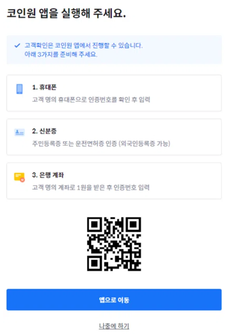 이메일과 비밀번호를 입력하고, 이메일로 전송된 인증번호를 확인하면 회원 가입 절차가 완료됩니다. 이 단계에선 로그인이 가능하지만, 거래를 하려면 코인원이 요구하는 신원 확인(Know Your Customer) 절차를 거쳐야 합니다. 이 과정은 휴대전화에 설치된 코인원 앱을 통해서 이뤄집니다. 스마트폰이 없거나 코인원 앱을 깔지 않으면 진행할 수가 없습니다.
