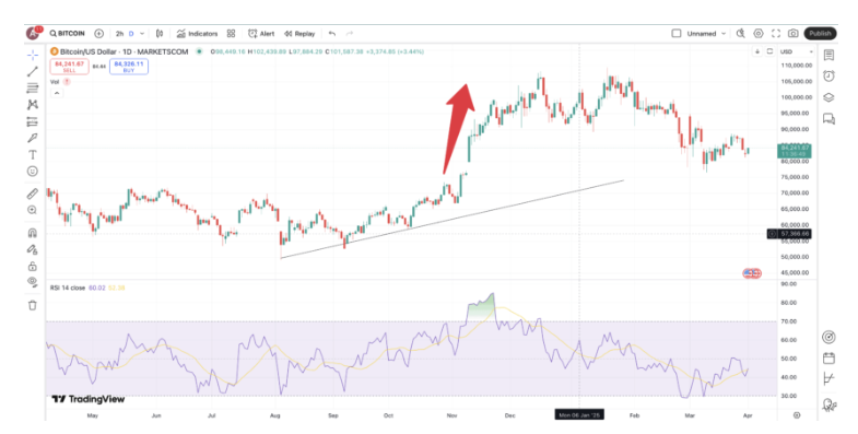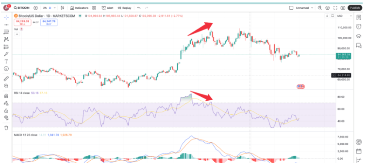 - RSI 과매수 상태: RSI가 70 이상이면 비트코인이 과대평가된 상태일 수 있습니다.