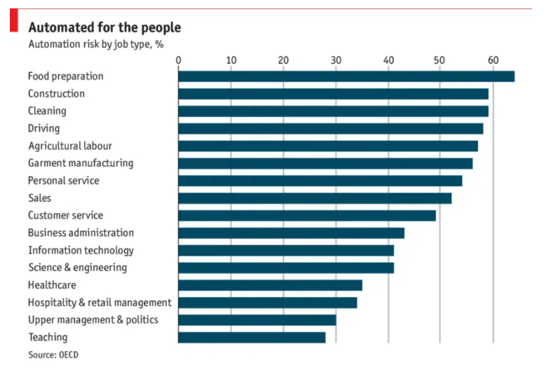 업무 자동화는 블루칼라와 화이트칼라 일자리를 모두 위협하고 있습니다. 로봇이 기존 블루칼라 산업군이 처리하던 업무를 대신하고 있으며, AI와 고급 소프트웨어는 전통적으로 화이트칼라의 일이었던 지식 산업 분야를 대체하기 시작했습니다.