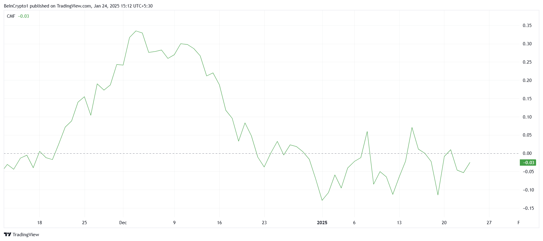 리도 DAO의 거시적 모멘텀은 차이킨 머니 플로우(CMF) 지표가 0선 근처에 머물면서 주목받고 있습니다. 이는 유입과 유출이 균형을 이루고 있으며, 매수 압력에 대한 명확한 선호가 없음을 시사합니다. 상승 모멘텀을 촉발하려면 CMF가 이 선을 확고한 지지로 전환하고 계속 상승해야 합니다.
