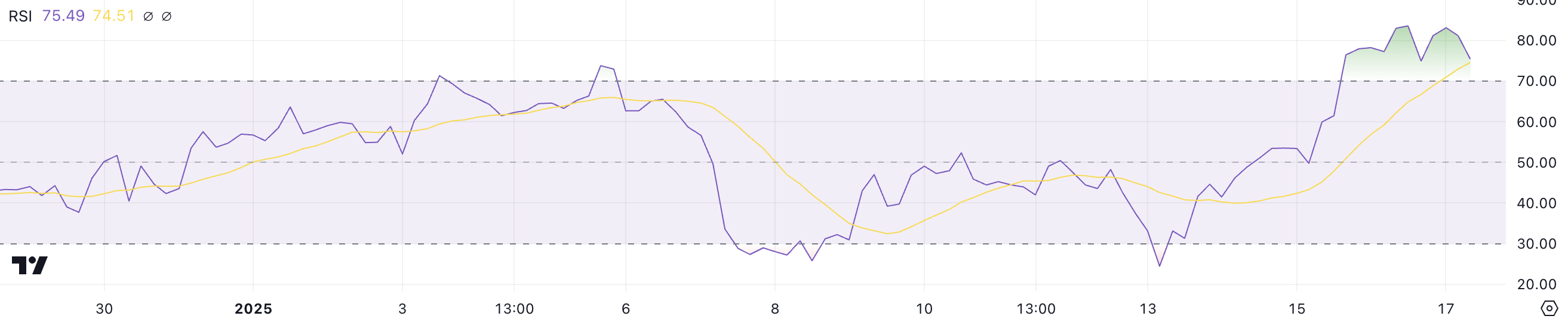 현재 라이트코인 RSI가 75.4에 위치해 있어 자산은 여전히 과매수 상태입니다. 이는 모멘텀이 둔화될 경우 냉각기나 단기 조정의 신호일 수 있습니다. 그러나 강한 상승 모멘텀은 종종 RSI를 장기간 높은 수준으로 유지시켜 추가 상승 가능성을 시사합니다.