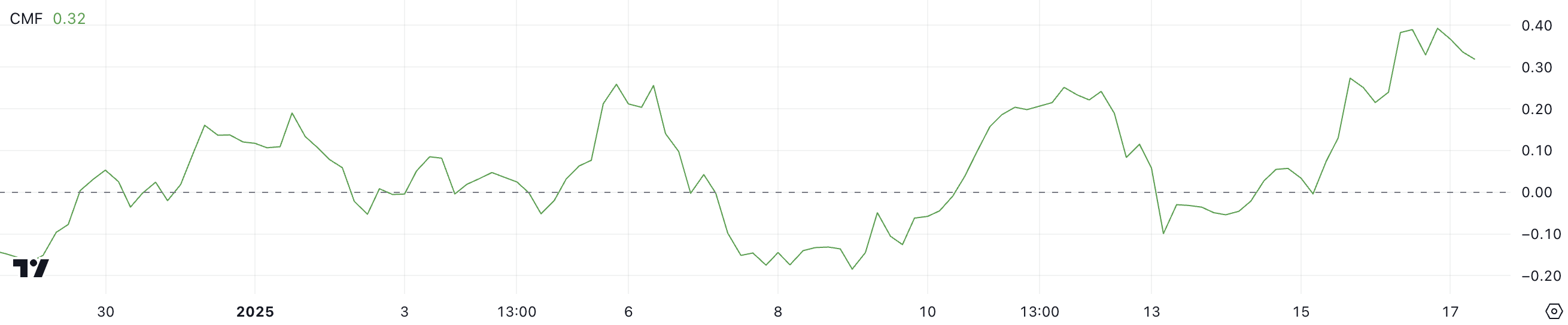 CMF(차이킨 머니 플로우) 지표는 LTC에 대해 현재 0.32에 위치해 있으며, 몇 시간 전 0.39의 정점을 찍었습니다. 이는 4일 전 -0.1에서 상승한 것입니다. CMF는 특정 기간 동안 자산으로의 자금 유입과 유출을 가격과 거래량 데이터를 사용하여 측정하는 지표입니다.