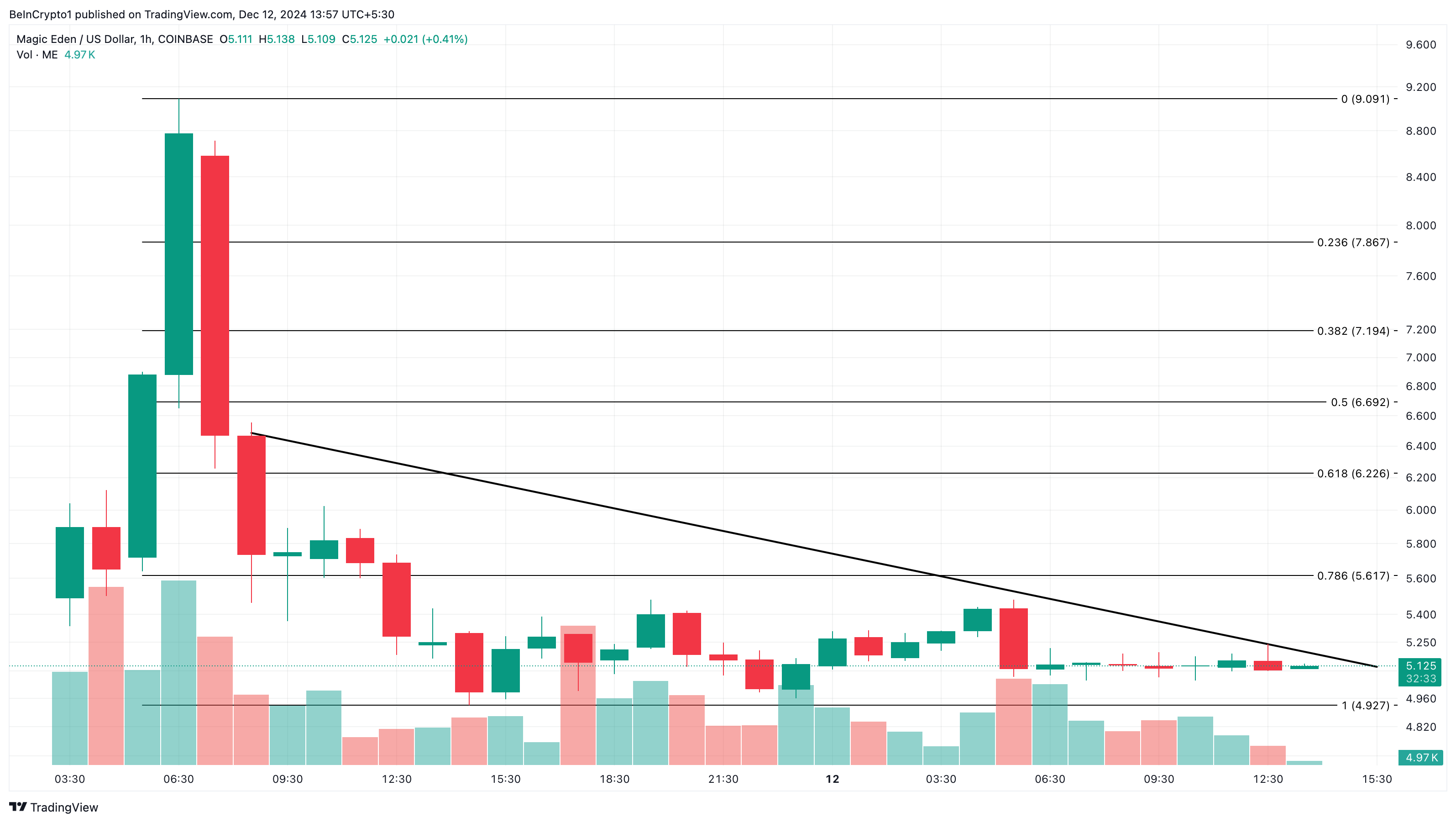 매직 에덴 토큰 거래량이 감소하는 상황에서, 가격이 더 낮아질 수 있습니다. 이 경우, ME의 가격은 단기적으로 4.93달러까지 하락할 수 있습니다.