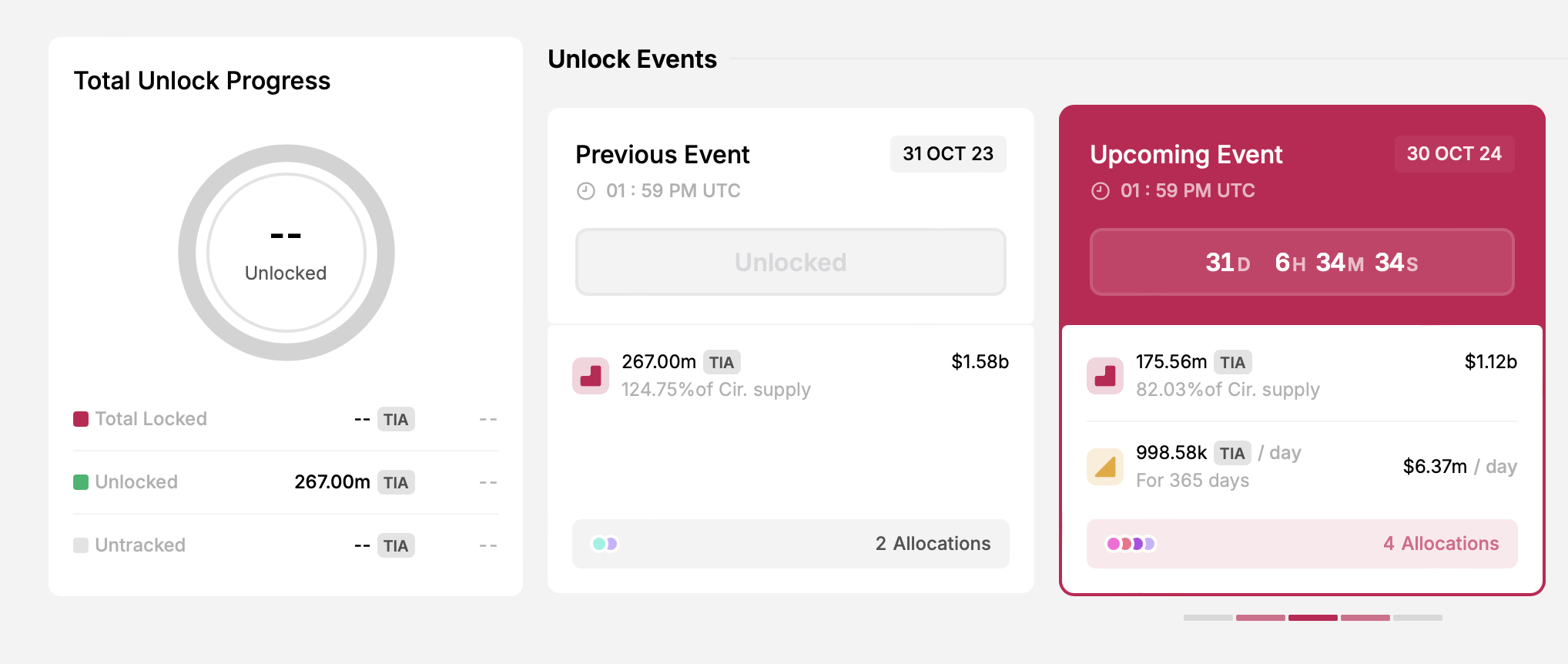 이번 달 가장 큰 클리프 토큰 언락에는 Celestia (TIA), Sui (SUI), 이뮤터블 (IMX), Aptos (APT), 그리고 Arbitrum (ARB)이 포함됩니다.