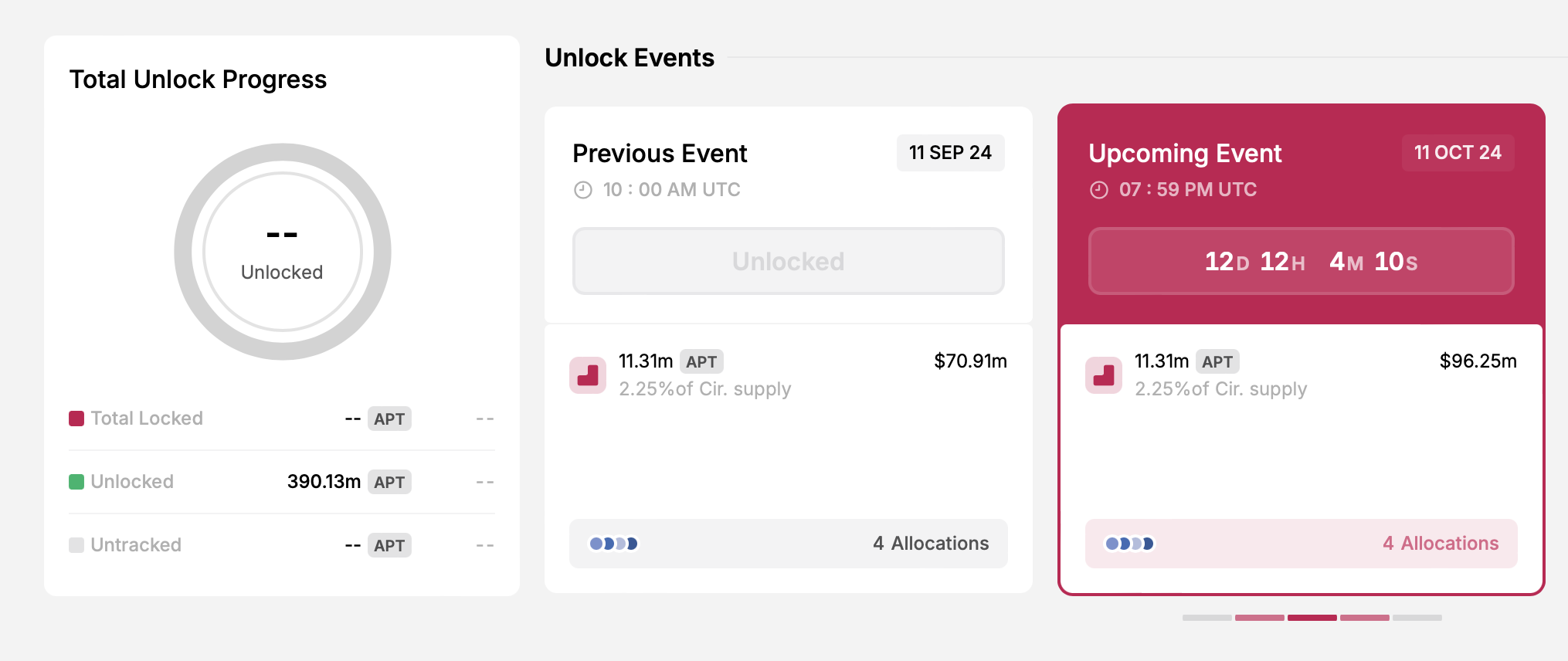 Aptos의 10월 11일 언락에서는 1131만 APT 토큰이 시장에 풀릴 예정입니다. 이 수치는 APT 총 공급량의 2.25%에 해당하며, 총 가치는 9625만 달러입니다.