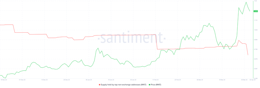그러나 모든 랠리와 마찬가지로 매도가 발생하여 맨틀의 가격에 영향을 미쳤습니다. 비거래소 고래 주소가 보유한 공급량에 따르면 이미 약 3,000만 MNT가 매각되었습니다. 3,600만 달러 상당의 토큰은 엄청난 금액이지만, 암호화폐 자산이 사상 최고치를 기록했기 때문에 예상된 일입니다.
