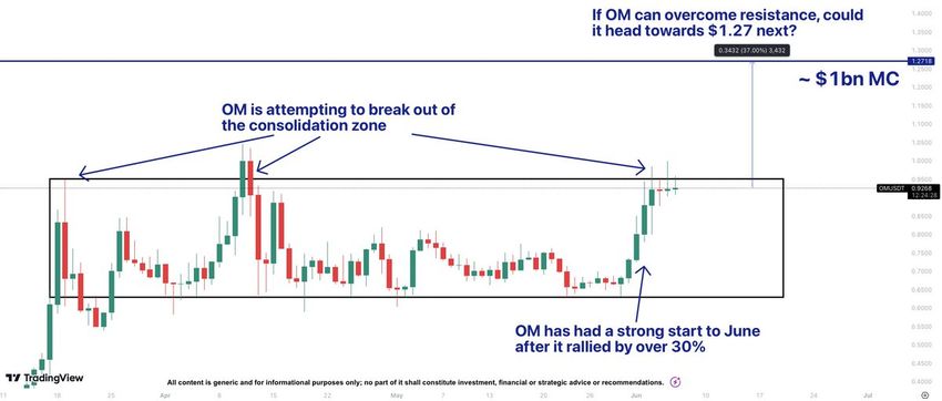 크립토세이빙엑스퍼트의 기술적 분석은 OM이 바닥을 다지는 구간에서 벗어날 수 있는 잠재력을 보여줍니다. 분석에 따르면 OM이 현재의 저항 수준을 극복하면 1.27달러에 도달할 수 있다고 합니다. 이러한 인사이트는 암호화폐 시장의 광범위한 추세와 일치하며, 실제 자산 토큰화에 대한 관심이 높아지고 있음을 강조합니다.