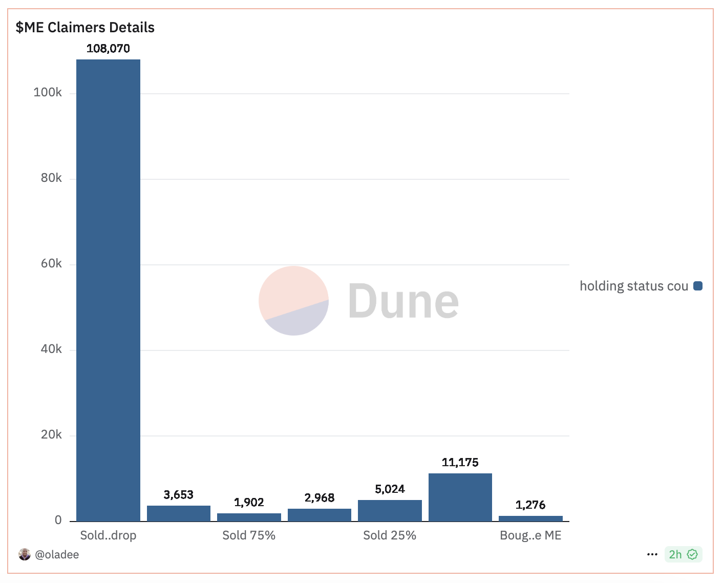 지금까지 13만3888개의 지갑이 ME 토큰을 청구했으며, 10만8070개의 지갑, 즉 약 80%가 에어드롭에서 받은 모든 할당량을 판매했습니다.