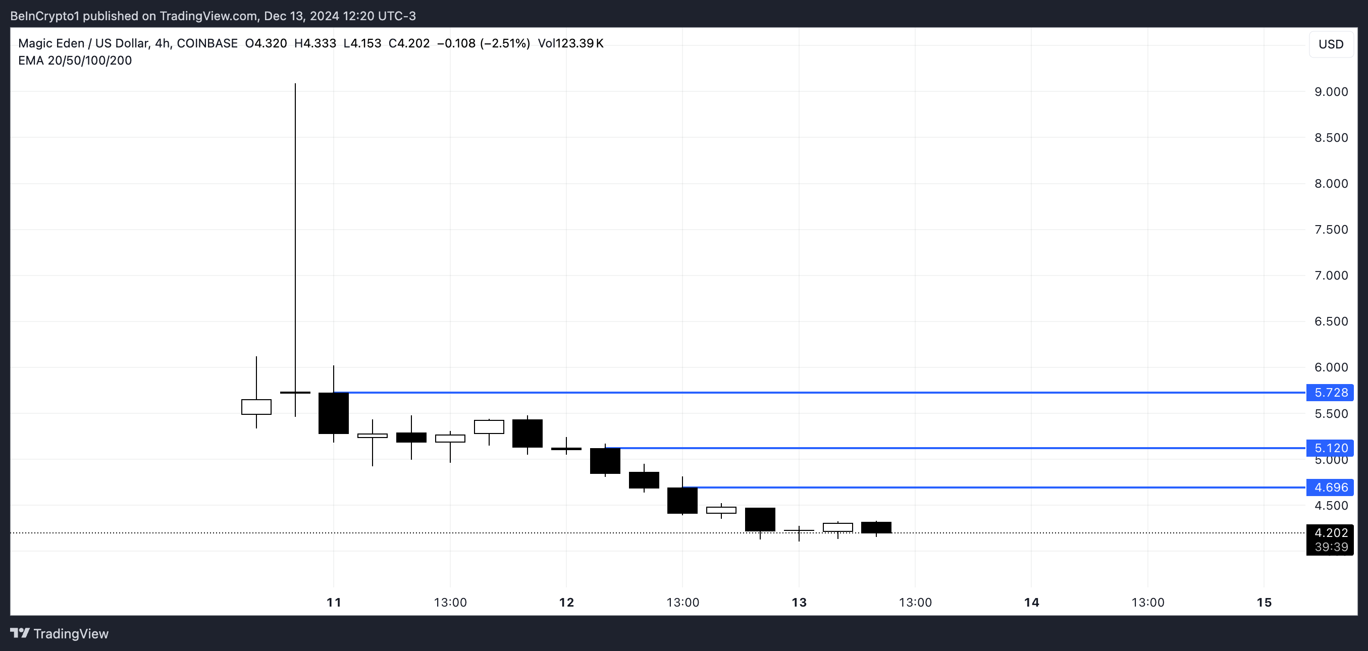 현재 하락세가 지속된다면, 매직에덴 가격은 다음 주요 지지 수준인 4달러를 테스트할 수 있습니다. 이 수준 아래로 하락하면 추가적인 약세를 나타낼 수 있으며, 이는 매도 압력의 연장으로 이어질 수 있습니다.