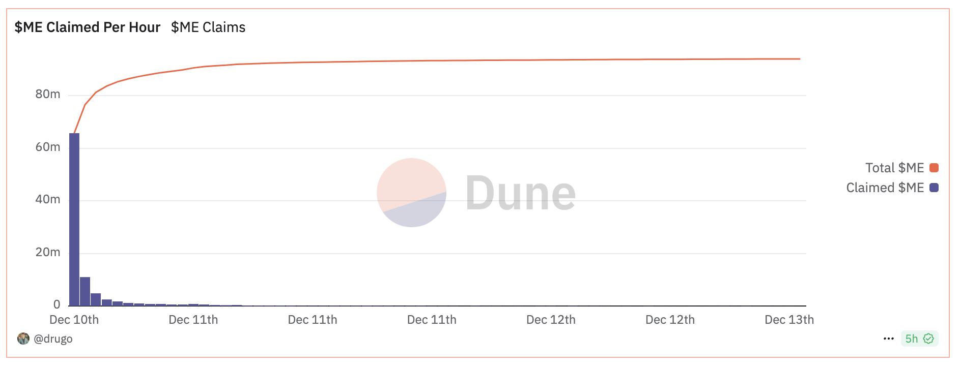 에어드롭에서 배포된 1억2500만 개의 ME 토큰 중 약 9400만 개가 이미 청구되었습니다. 이는 총 공급량의 75%에 해당합니다.