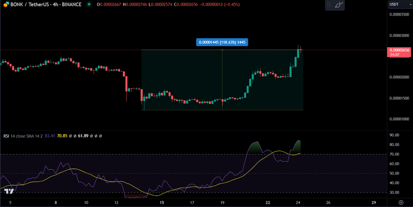24일 BONK의 가치는 0.00002753 달러로 급등하여 4월 초 이후 가장 높은 가격을 기록했습니다.