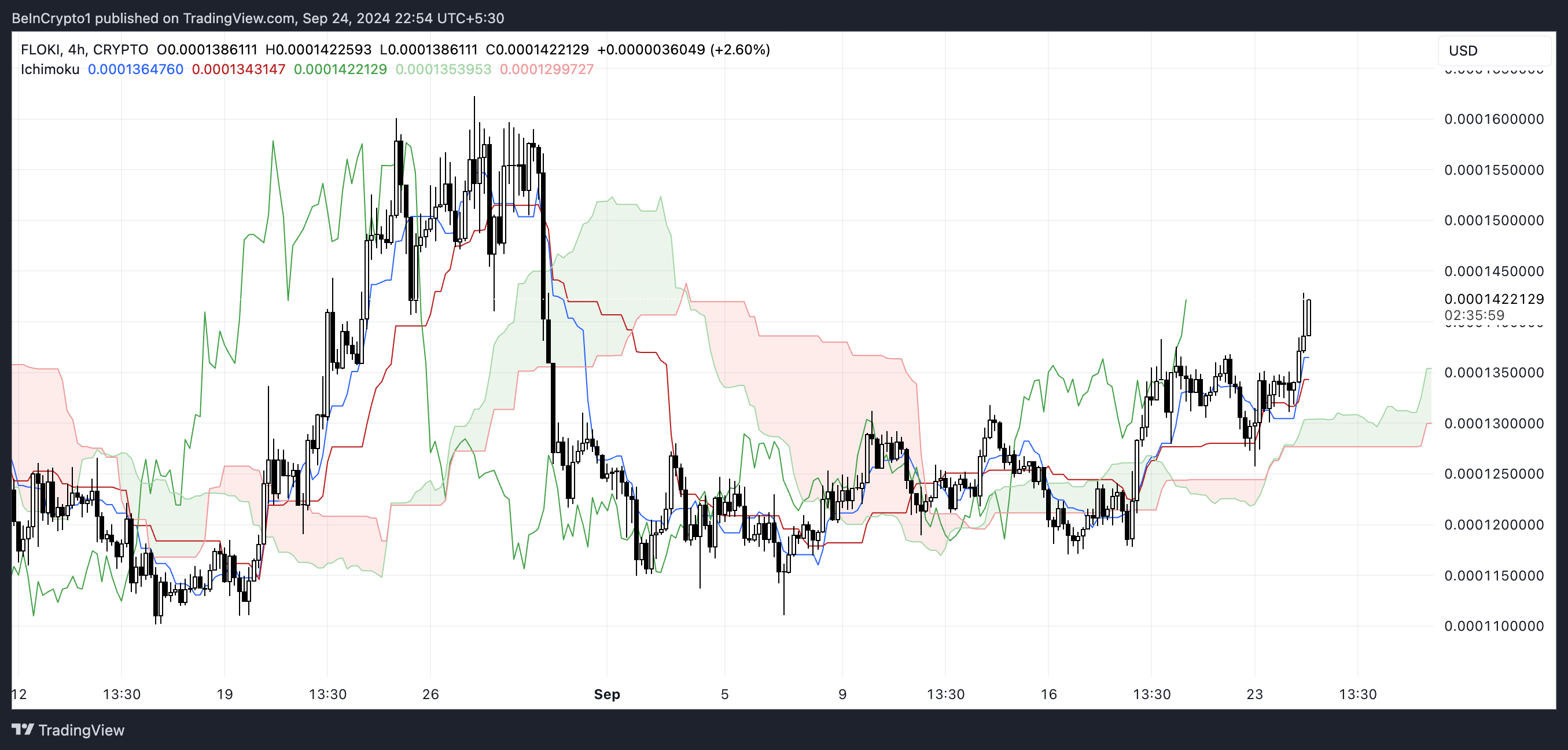 FLOKI의 4시간 차트에 있는 이치모쿠 구름은 현재 가격 움직임과 시장 감정에 대한 통찰력을 제공합니다. 이 기술 지표는 잠재적인 지지 및 저항 수준, 추세 방향 및 모멘텀을 강조합니다.