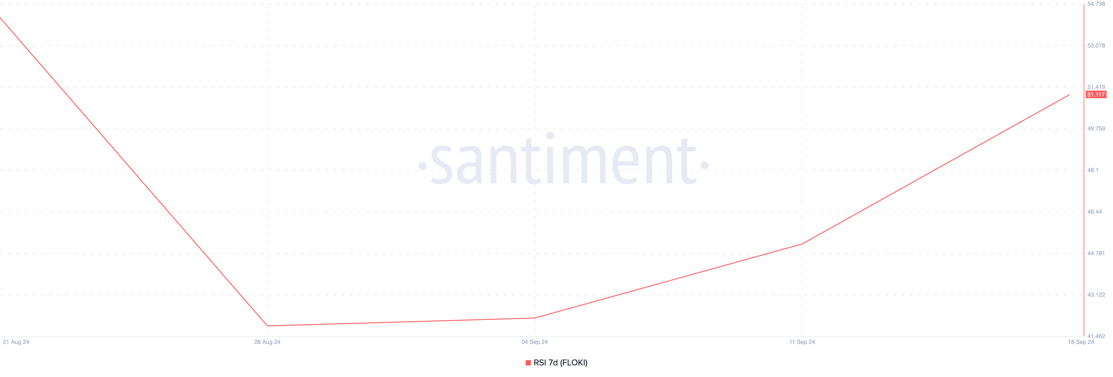 FLOKI의 7일 RSI는 현재 51로, 지난 주 동안 가격 모멘텀이 중립적임을 나타냅니다. RSI는 최근 가격 변동의 속도와 크기를 측정하며 0에서 100까지의 척도로 운영됩니다.