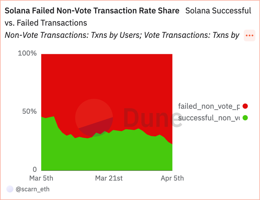 듄 애널리틱스의 최근 데이터에 따르면 4월 4일 솔라나에서 ‘비투표’ 거래의 77% 이상이 성공하지 못했습니다. 이는 네트워크 사상 가장 높은 실패율입니다.